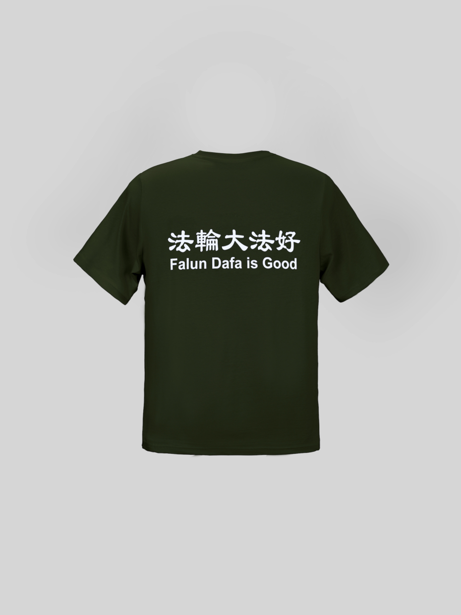 100%純棉面料,柔軟舒適,透氣排汗。T恤衫背面印有「法輪大法好」。「法輪大法」是佛家上乘修煉大法,以「真、善、忍」為最高指導原則,並輔之以五套舒緩優美的功法。修煉法輪大法不僅能改善健康、提昇道德,也賦予修煉者最純正的能量。