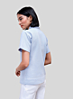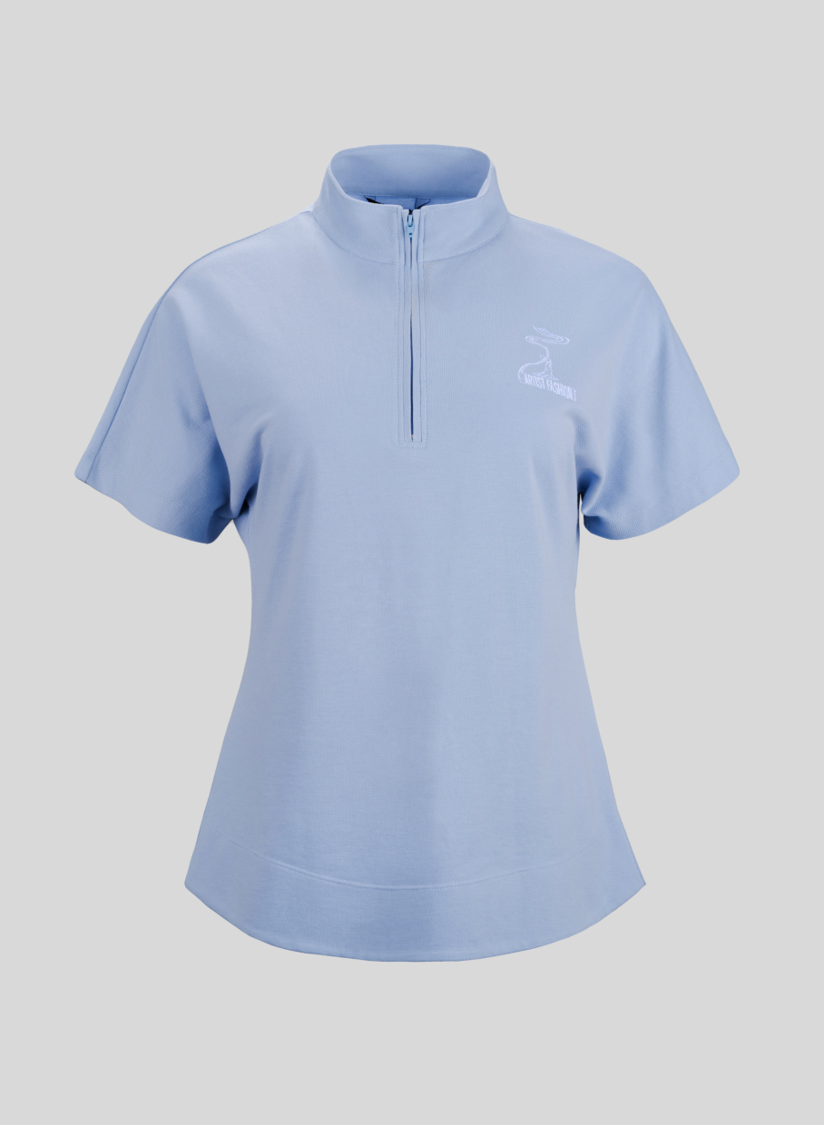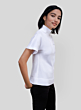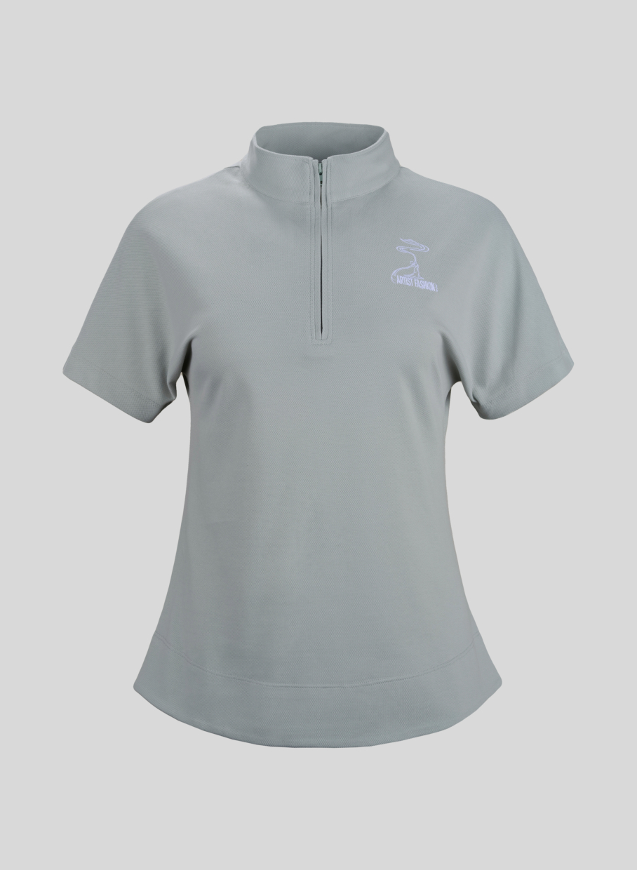 這款面料是100%的皮馬珠地棉(Piqué),不同於一般的棉質面料,這款面料的編織方法讓她具有獨特的紋理和花型。立領、半拉鍊、無縫的肩部設計,微有弧度的下擺,將古典女性服飾的美與現代服飾的設計需求完美結合,襯托出女性的柔美、優雅的體態。